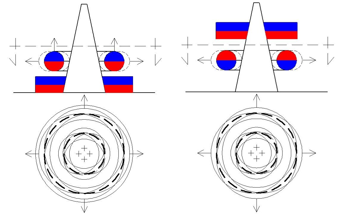 In both case there can be used electromagnets for better control of the system. Especially if to apply a cylindrical shape of the central shafts the use of electromagnets is important and necessary, because only with the application of electromagnets one can than control propulsion and acceleration of the system. The system wasn't tested yet.