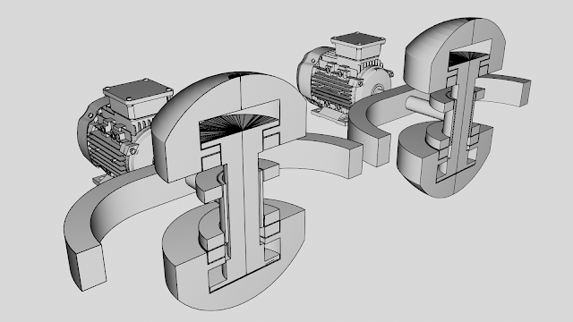 A drawing showing magnetically controlled inertial system for propulsion with application of two independent weights. System can to work both on magnetic repulsion and attraction with relation to the side of device in vertical plane. The main shaft is sliding in slightly larger pipe which is conjoined with cross - shaft which is connected to external holder - ring on ball bearings. Simultaneously both electromagnets are powered by external source of current, so they working on repulsion or attraction in pairs - two are in rotating weights and two are joined with larger lubricated pipe. During one pair of electromagnet are working on repulsion another is working on attraction, so the magnetic impulse is every time strong allowing for fast rotating and compensating strong centrifugal forces. The rotating weights are partially hollow inside where part of central shaft can hide deeper or shallower. Every of electromagnets have holes inside in which the main shaft can reciprocate. Entire system is powered by electric motor mounted to cross - shaft from one of the sides.