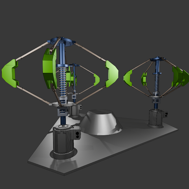 When the spring is compressed in upper direction it is pushing on upper collar. The balls are trying to take most distanced position from the center of rotation, so bottom collar is pushing on the spring by application of centrifugal force. This system is paired and in assumption is to be powered by two electric motors with connection to the plug. Bottom ropes are made from steel they are loose and upper are stiff and also are made from steel. The upper ropes-rods have pivot point at the top. Balls are made from steel. They are five in number. This system is predicted to work with high RPM.